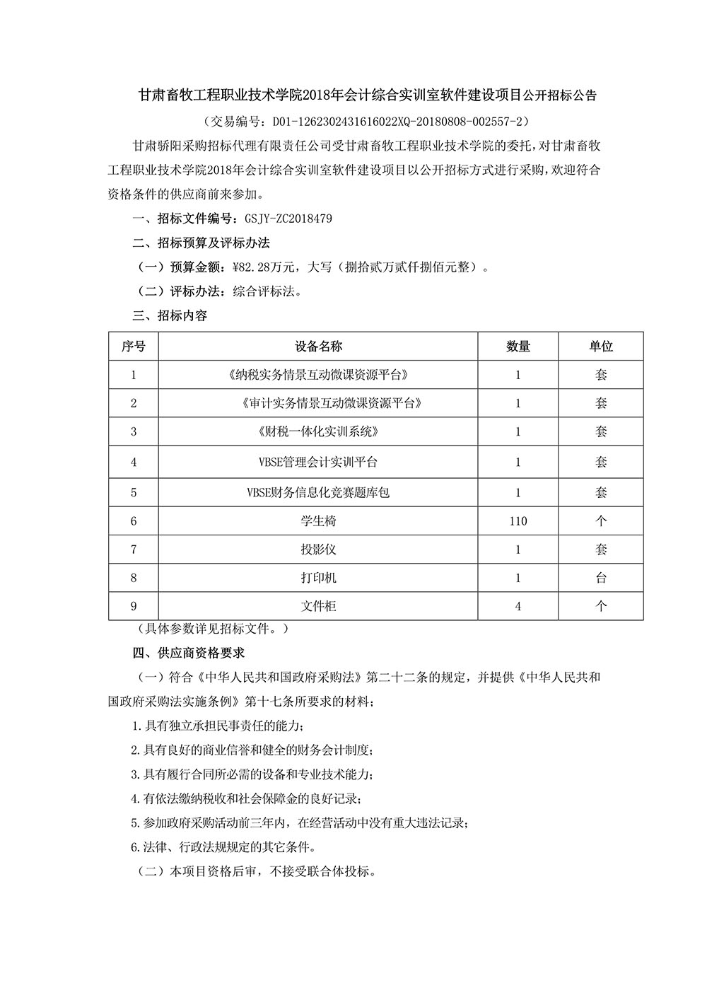甘肃畜牧工程职业技术学院2018年会计综合实训室软件建设项目公开招标公告 来源:国资基建处 发布时间:2018-11-16 16:32:00 浏览次数:次 【字体:小 大】 分享到: 【打印正文】 相关信息