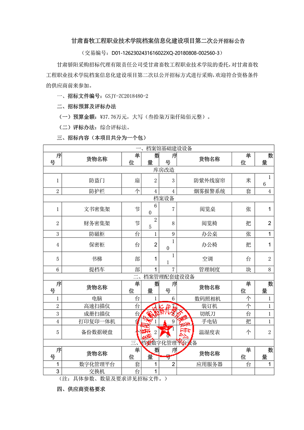 甘肃畜牧工程职业技术学院档案信息化建设项目第二次公开招标公告