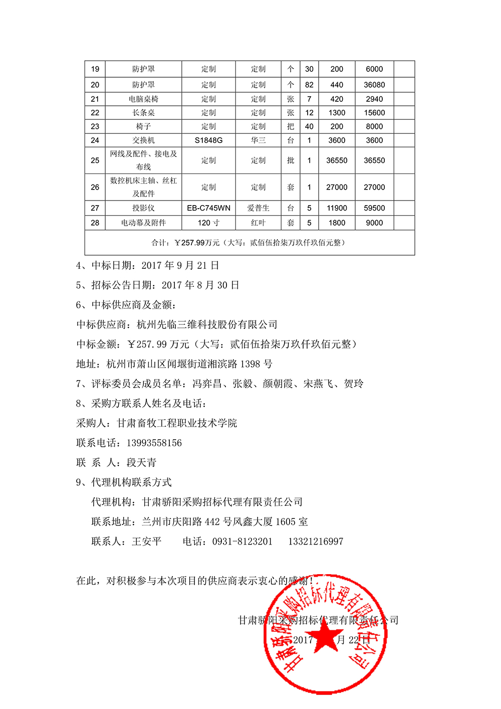 甘肃畜牧工程职业技术学院加工制造机械实训项目中标公告