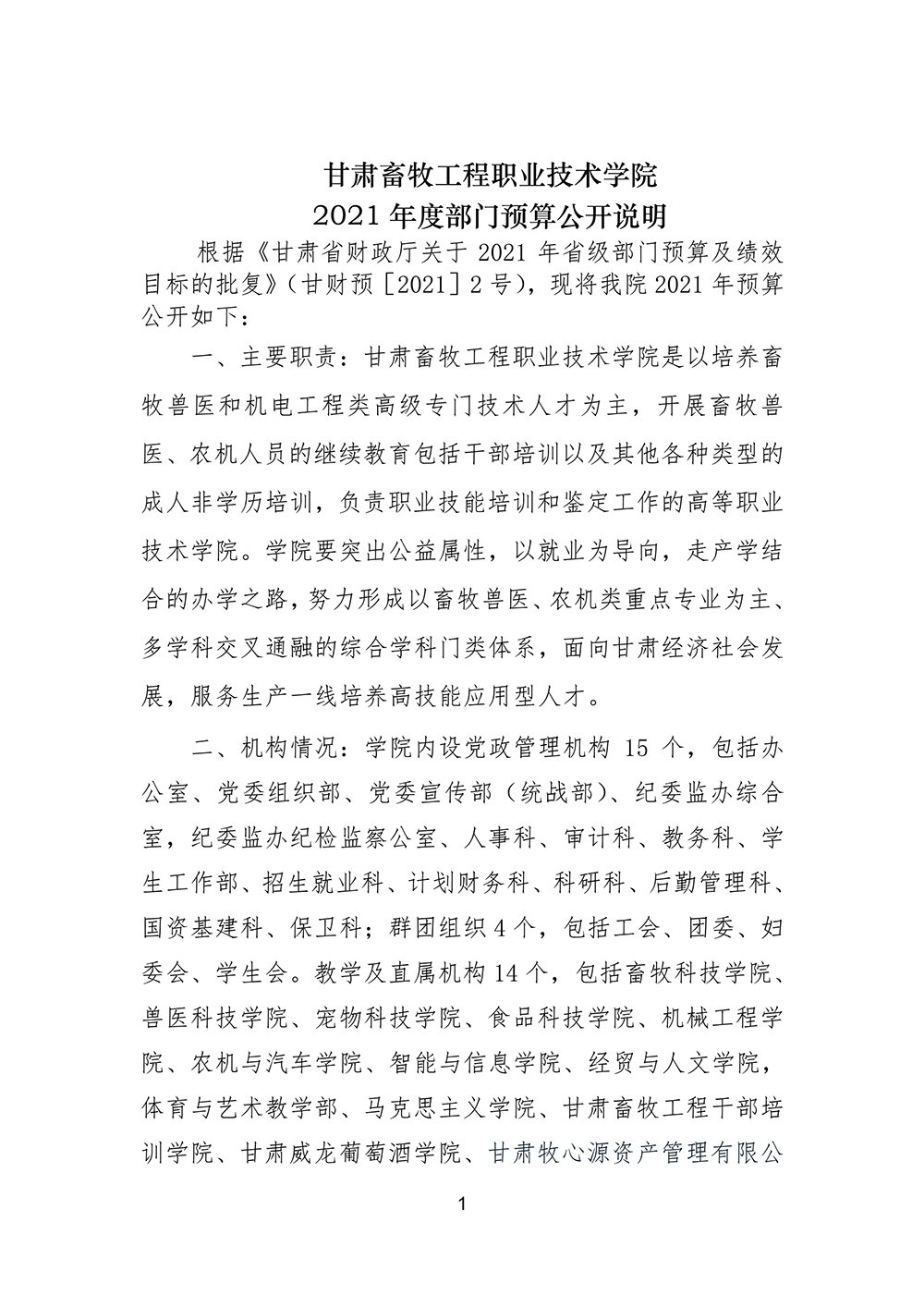 甘肃畜牧工程职业技术学院2021年度部门预算公开说明 发布时间:2021-03-09 14:43:00 浏览次数:次 【字体:小 大】 附件1:甘肃畜牧工程职业技术学院部门预算公开表.xlsx附件2:畜牧工程职业技术学院项目支出绩效目标表(干部培训学院)【事校】(1).xls 终审:宣传部 在线帮助 分享到: 【打印正文】 相关信息