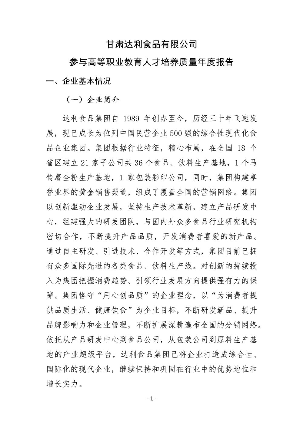 甘肃达利食品有限公司参与高等职业教育人才培养质量年度报告(2022) 发布时间:2023-01-05 15:57:00 浏览次数:次 【字体:小 大】 终审:宣传部 分享到: 【打印正文】 相关信息文档中心