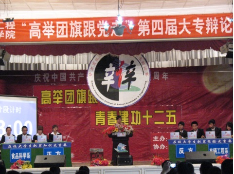 2012年6月11日晚,由学院团委、院学生会主办,各系团总支、系学生分会协办的“高举团旗跟党走”第四届大专生辩论赛总决赛在西校区大学生活动中心隆重举行。学院党委书记张文兴、副院长杨孝列和各部门负责同志及1000余名同学观看了辩论赛总决赛。