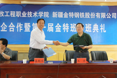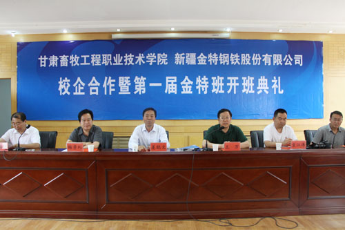 2012年7月3日上午,学院与新疆金特钢铁股份有限公司校企合作成立的第一届金特班在办公楼一楼会议室举行及开班典礼。副院长姜聪文、杨孝列、教务处处长王海涛、招生就业处处长汪公明,新疆金特钢铁股份有限公司党委副书记王万、人力资源部副部长袁江涛和学院相关处(室)、系(部) 的负责人及第一届金特班全体同学参加了开班典礼。会议由教务处处长王海涛同志主持。
