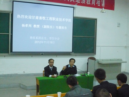 2012年11月19日晚,学院副院长杨孝列教授为兽医系12级新生班团干部做了主题为:“不要等待机会,要创造机会”的专题讲座 。