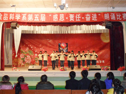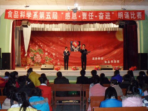 2012年12月19日晚,食品科学系在学院西校区大学生活动中心举办了第五届“感恩.责任.奋进”为主题的朗诵比赛,食品科学系全体师生观看了比赛。
