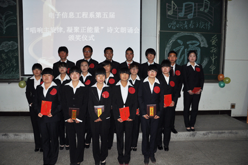 4月2日晚,电子信息工程系举办的“唱响主旋律,凝聚正能量”配乐诗朗诵比赛在东校区阶梯教室落幕。该系领导、辅导员、班主任及300多名学生观看了比赛。 本届比赛经初赛、复赛、半决赛,最后有16组选手进入决赛。最终李玲花、高小婷 唐金鹏获一等奖; 张倡荣 、贾茹、石桥、张树斌、王梦阳获二等奖;唐晓凤、镡旭妹、陈占勇、尚文静、任蕊蕊、赵丽、郭宏超、王璎获三等奖;胡爱丽等4位选手获优秀奖。 (电信系 吕淑君报道)