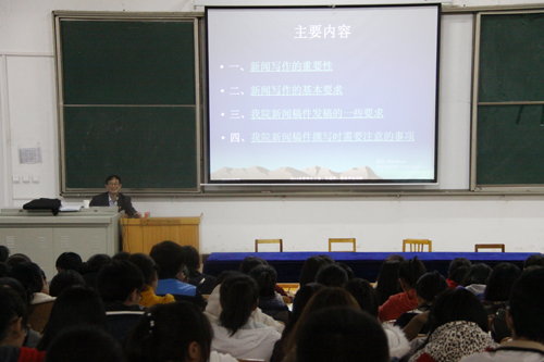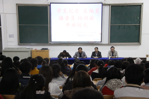 10月15日晚,由党委宣传部、院团委联合举办的2014年度学生记者、采编员、播音员培训班在东校区阶梯教室开班。副院长王袆才,宣传部部长贺得飞、副部长孟学奇,团委副书记、学工部副部长王哲毓,“青年之声”广播站全体成员,团委宣传委员,各系团总支、学生分会宣传委员近200人参加了开班仪式。孟学奇主持会议。