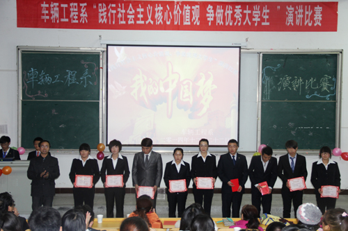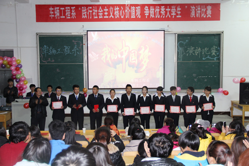 “践行社会主义核心价值观,争做优秀大学生”演讲比赛决赛于2014年12月22日晚在新教学楼阶梯教室举行,共有17位选手进入决赛。参赛选手们演讲气势雄浑,各具特色,赢得了现场观众的阵阵掌声。经过激烈角逐,最终,东风14.2班朱天鼎获得一等奖,汽营13.1班侍世江和东风14.2班达亨宏获得二等奖,汽制14.1班锁九妹、汽检13.2班王玉德和农机13.1班田敬获得三等奖,汽检13.1班宗廷贤、农机13.1班李捷、农机13.3班安广艳和东风14.2班窦林强获得优秀奖。