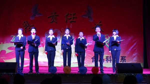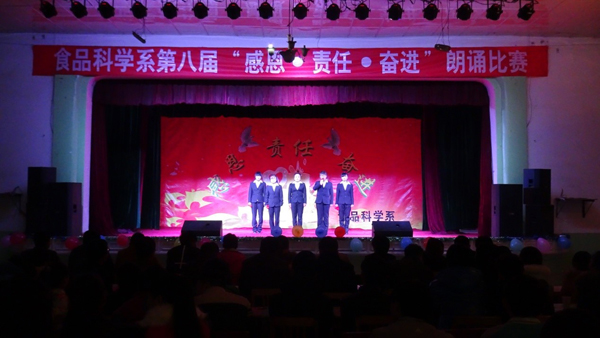 2015年12月28日晚,食品科学系在学院西校区大学生活动中心举办第八届“感恩·责任·奋进”为主题的朗诵比赛,全系师生观看了比赛。 选手们朗诵了《我的祖国》《岁月 母亲》《感恩父母》《爱在左,感恩在右》《倦子归时》等作品。最终食品营养与检测14.2班夏文波、王国玉和食品营养与检测14.1班候婷婷获得一等奖,翟凯珑、刘爱霞、包若涵等9名同学分获二、三等奖。 (食品科学系 王光耀报道)