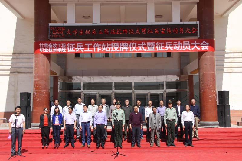 6月2日上午,甘肃畜牧工程职业技术学院大学生征兵工作站授牌仪式暨征兵宣传动员大会在西校区2号教学楼前小广场举行,武威市征兵工作领导小组副组长、武威军分区司令员万发忠,武威市市委常委、副市长李成日,凉州区区委常委、凉州区人民武装部政委扬旗山,武威军分区司令部参谋周廷祥,武威市委宣传部副部长陈万能,武威市教育局副局长雷蕴忠,武威市文广局副局长王娟,武威市网信办副主任黄海本等领导出席大会。主持学院工作的副院长杨孝列,副院长张延贵、王祎才,学院六系一部党总支书记、武装部、学生工作部、宣传部、教务处、招生就业处、团委等部门的负责人,以及畜牧系、兽医系的全体师生约1200余人参加了仪式。武威日报社、武威电视台、凉州频道等新闻媒体的记者现场报道。副院长张延贵主持大会。