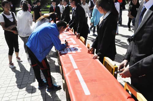 电子信息工程系辅导员、“青创”创业者协会指导老师贾德旺现场指导活动。学院部分社团代表、各系学生会负责人以及 “青创”创业者协会成员参加了活动。活动中,同学们首先在‘珍惜资源、保护环境、从我做起’的条幅上签名。