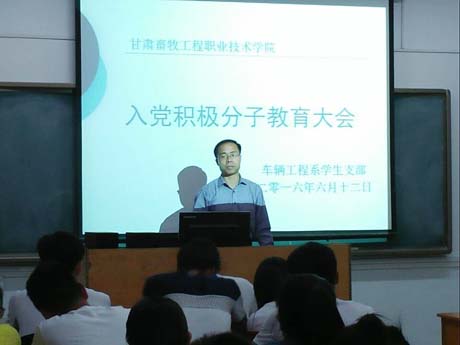 2016年6月12日晚,车辆工程系学生支部在东校区1号教学楼举行了入党积极分子教育大会。车辆工程系党总支副书记席爱学、学生支部书记董文亮、学生支部宣传(统战)委员杨永彪参加会议。
