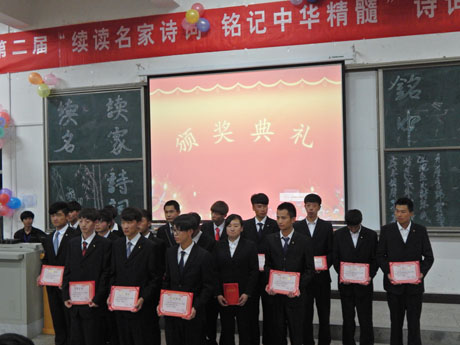 本次比赛以班级为单位参赛,经过初赛筛选,共有8个班级代表队进入了决赛。参赛队每队由3名选手组成,决赛阶段设置了孤军奋战、过关斩将、快问快答、命悬一线四个环节,通过选手单兵挑战和团队合作对抗,不仅考验了选手个人诗词积累量,还体现了团队合作的默契度。经过激烈的角逐,最终农机14.2班获团体第一名,农机14.1班、汽检15.1班分获团体二、三名,汽营15.1班获得精神文明奖。王勃、庄映龙、李具朋3名同学荣获个人一等奖,曹晟、陈欢、苏憨憨、赵岩伟、马瀛福、蔡丽娟等6名同学荣获个人二等奖,吕晶、马乾梅、赵红、姚国荣、徐恒裴、李晓祥、韩园园、周秋虎、马维林等9名同学荣获个人三等奖。
