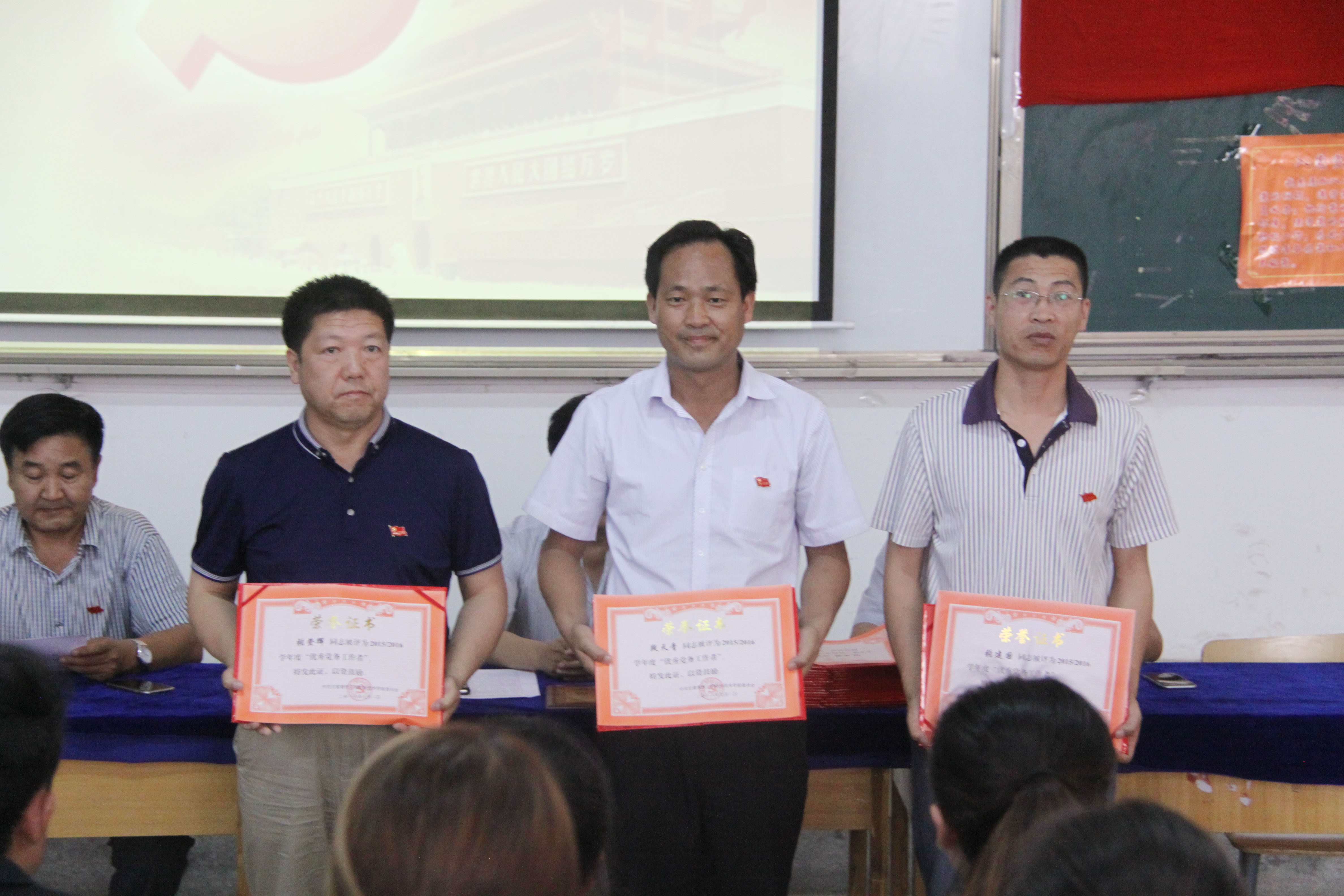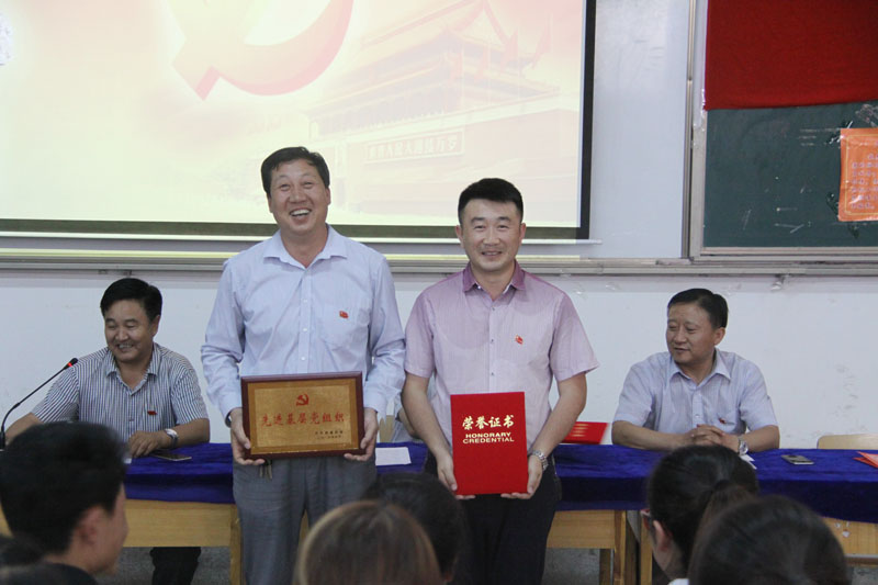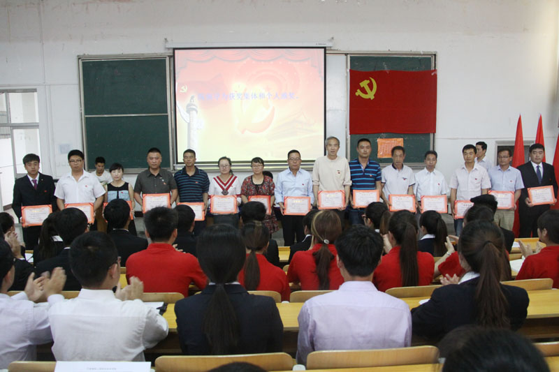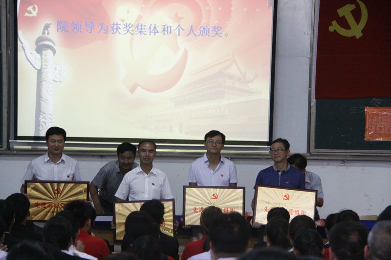 副院长王祎才同志宣布省教育厅《关于表彰厅系统优秀共产党员、优秀党务工作者、先进基层党组织的决定的决定》、中共武威市委《关于表彰全市优秀共产党员、优秀党务工作者和先进基层党组织的决定》、学院党委《关于表彰优秀共产党员、优秀党务工作者、先进基层党组织的决定》。基础部党总支被省教育厅评为优秀党组织,杨罗成、车清明两位同志被评为厅级优秀党员,王祎才、吴应昌两位同志被评为厅级优秀党务工作者;食品科学系党总支被武威市委评为先进基层党组织,李芳同志被评为武威市级优秀党员,王光耀同志被评为武威市级优秀党委工作者;兽医系党总支、机关一支部、机关六支部、车辆工程系学生支部及杨世禄、段天青等19名同志受到学院党委表彰。院领导为获奖集体和个人颁奖。