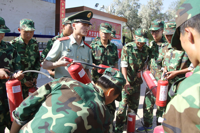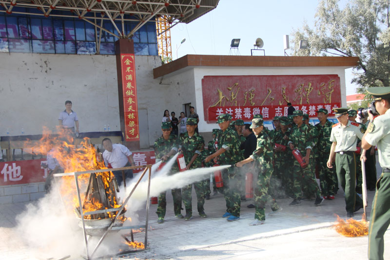 在消防人员详细讲解了灭火器的使用步骤、灭火要领并演示灭火过程之后,部分同学现场进行了火势扑灭演练。之后,所有人员参观了禁毒宣传展板。