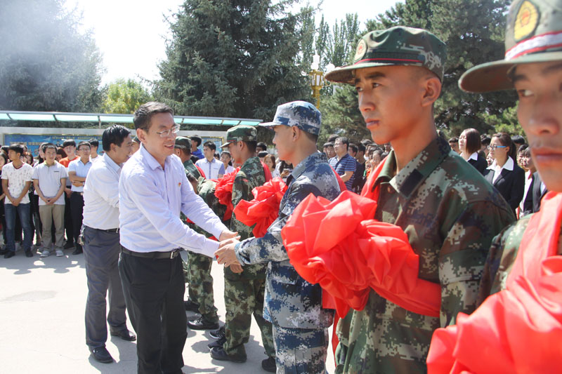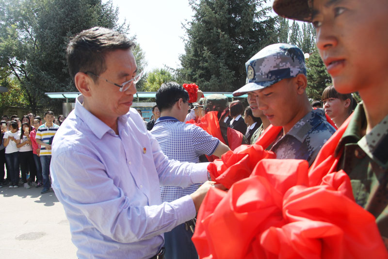 副院长王祎才在东校区欢送仪式上携同系部领导共同为入伍学生佩戴大红花并代表学院发表讲话,他指出依法服兵役是每个公民的神圣职责,参军报国是新世纪青年的热切向往。甘肃畜牧工程职业技术学院有着悠久的拥军报国的光荣传统,几年来,一批又一批热血青年义无反顾地奔赴军营,为保卫国家安宁、维护世界和平做出了积极贡献。他们在部队中表现突出,在军营中树立起了大学生应有的风采,为学院争得了荣誉。强调和平与发展是当今时代的主题,但强权政治和霸权主义依然存在。强调国无防不立,民无防不安。指出当前祖国政治稳定,经济稳步发展,人民安居乐业,良好的局面来之不易,离不开党的正确领导,离不开全国各族人民的共同努力,更离不开稳固的国防和强大的军队的安全保障。他希望今年应征入伍的同学要加强学习,提高政治素质。要忠于职守,苦练军事技能。要严守纪律,安心部队生活。表示学院将进一步落实应征大学生入伍的优抚安置政策,积极配合有关单位深入开展拥军优属的活动,让入伍同志及全家在政治上、经济上得到更多的优待,合法权益受到更好的保护,尽最大的努力消除后顾之忧。