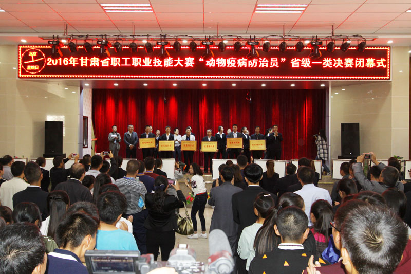 2016年9月25日上午11时, 2016年全省职工职业技能大赛“动物疫病防治员”省级一类决赛闭幕式在甘肃畜牧工程职业技术学院西校区大学生活动中心举行。甘肃畜牧工程职业技术学院党委书记李慕堂,省动物疫病预防控制中心主任贺奋义,省职业技能鉴定指导中心副主任邢晋儒,省兽医局副局长何其健,省动物疫病预防控制中心总兽医师李跃增,甘肃畜牧工程职业技术学院副院长杨孝列,武威市畜牧兽医局局长马占威,甘肃畜牧工程职业技术学院副院长张延贵出席了闭幕式。闭幕式由贺奋义主持。
