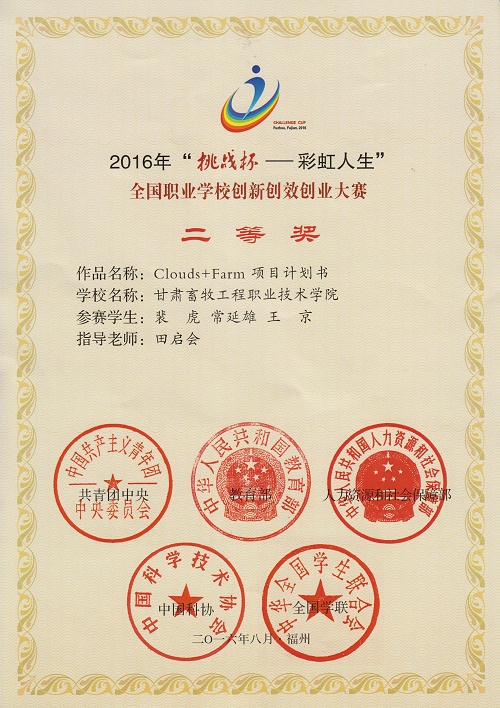 近日,由甘肃畜牧工程职业技术学院获得“挑战杯——彩虹人生”全国创新创效创业大赛二等奖的“Clouds+Farm项目计划书”获奖证书送达学院。