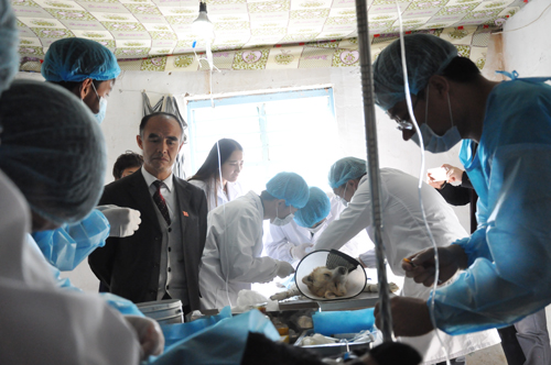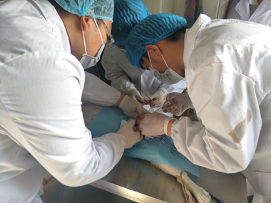 11月5日早晨,手术在一间简易的房间进行,志愿者们用自带的高压锅进行手术器械高温消毒,在对手术场地用紫外线和消毒液进行彻底消毒后,在指导老师田启会的指导下,同时进行了两例流浪母犬子宫摘除绝育手术,随行兽医系青年教师张国权、张亮、张潇文积极协助手术并对术后犬进行了康复治疗。