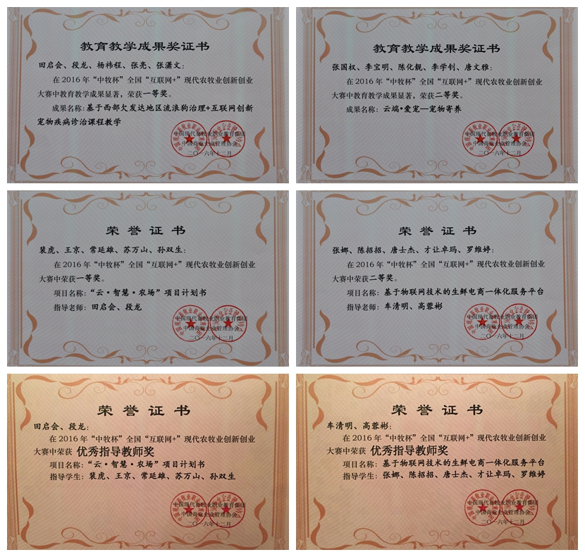 本次大赛经院校选拔,集团初赛,评委评审和现场PPT演示、答辩等环节,分别评选出教师组、学生组一等奖5项,二等奖10项,三等奖15项。我院兽医系田启会、段龙、杨祎程、张亮、张潇文老师的《基于西部欠发达地区流浪狗治理+互联网创新宠物疾病诊治课程教学》项目获2016年“中牧杯”全国“互联网+”现代农牧业教育教学成果一等奖,张国权、李宝明、陈化靓、李学钊、唐文雅老师的《云端·爱宠---宠物寄养》项目获二等奖;裴虎、王京、常延雄、苏万山、孙双生同学的《“云·智慧·农场”项目计划书》项目获2016年“中牧杯”全国“互联网+”现代农牧业创新创业大赛一等奖,张娜、陈招招、唐士杰、才让卓玛、罗维婷同学的《基于物联网技术的生鲜电商一体化服务平台》项目获二等奖,李芸、张伟军、杨东礼、陈玉香、卢灏同学的《“互联网﹠草编”项目计划书》项目获三等奖;田启会、段龙、车清明、高蓉彬老师分别获2016年“中牧杯”全国“互联网+”现代农牧业创新创业大赛“优秀指导教师”。
