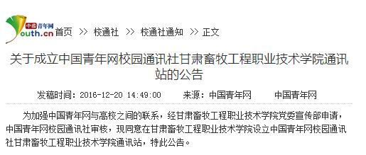 中国青年网校园通讯社甘肃畜牧工程职业技术学院通讯站将接受中国青年网校园通讯社和甘肃畜牧工程职业技术学院党委宣传部的共同管理与指导。