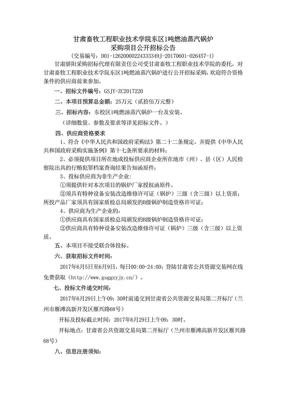 甘肃畜牧工程职业技术学院东区1吨燃油蒸汽锅炉招标公告