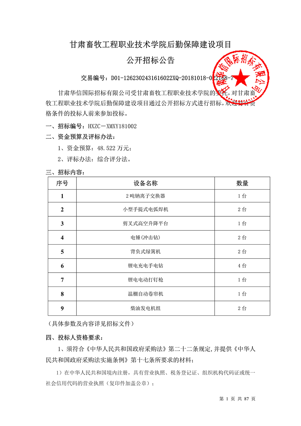 甘肃畜牧工程职业技术学院后勤保障建设项目公开招标公告