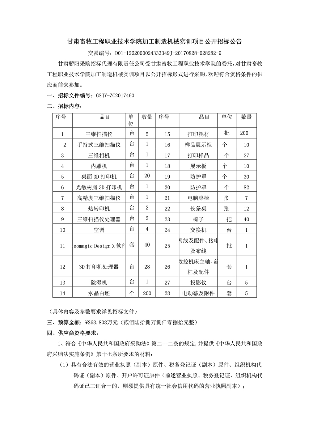 甘肃畜牧工程职业技术学院加工制造机械实训项目公开招标公告