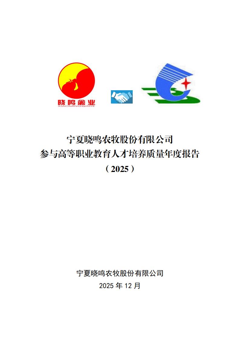 宁夏晓鸣农牧股份有限公司参与高等职业教育人才培养质量年度报告(2025) 发布时间:2026-01-09 15:31:00 浏览次数:次 【字体:小 大】 终审:宣传部 分享到: 【打印正文】 相关信息 查看演示