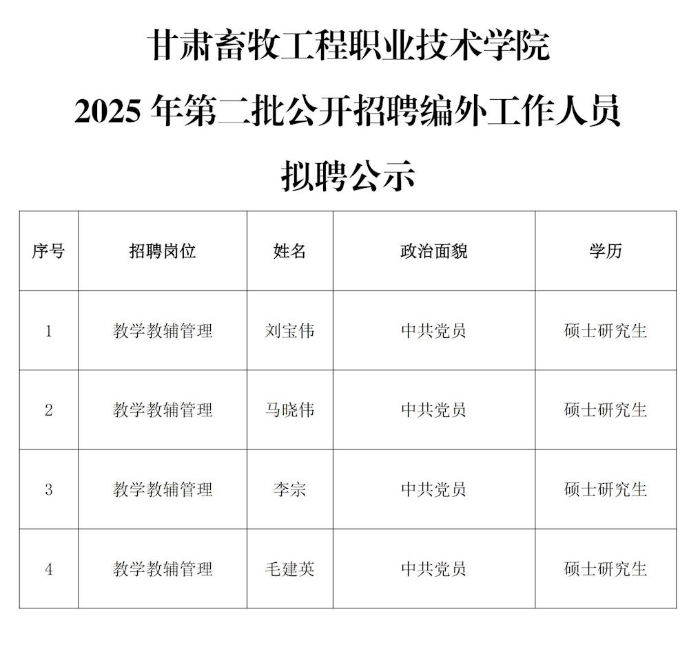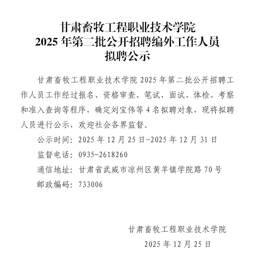 甘肃畜牧工程职业技术学院2025年第二批公开招聘编外工作人员拟聘公示